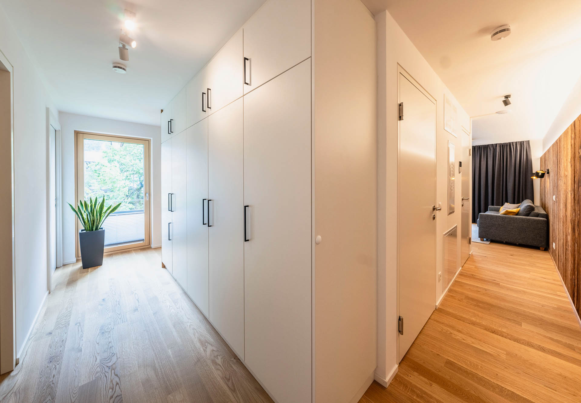 A fully equipped workstation (27-inch screen, external keyboard and mouse) is available for professional work, with docking station for connection via a single USB-C cable. You will also find a digital radio from Teufel in the living room, with the option to play your own music via Bluetooth. The Smart TV does not only offer a razor-sharp picture with brilliant colours, but also media libraries and film channels via waipu.tv. In the bedroom you will find a wireless charging station for up to 2 mobile phones, apple Watch or apple AirPods.